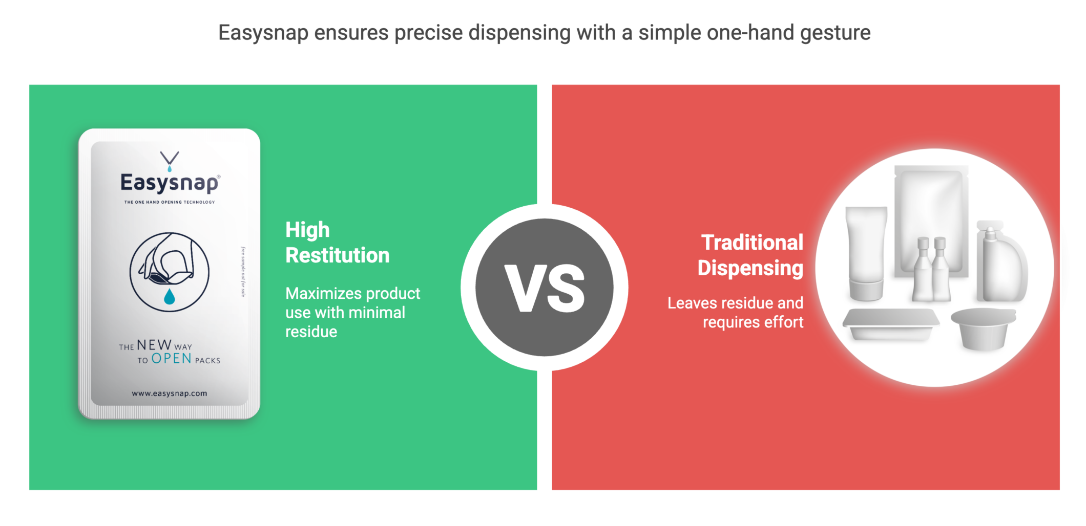 High restitution means maximizing product dispensing with minimal residue left inside the package. Easysnap® one-hand opening system ensures a product restitution of up to 98%, allowing for almost complete dispensing with a single, intuitive gesture.